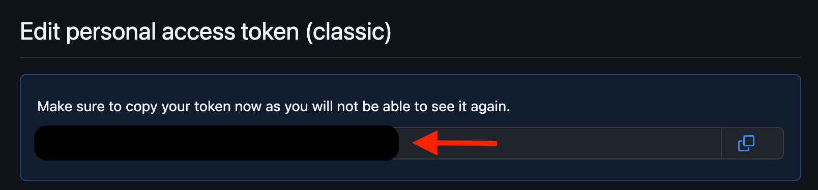 "ghp~" 접두어로 새롭게 생성된 token은 복사를 해서 따로 저장을 해두시면 됩니다. 위 화면에서 새로고침하면 token을 다시 확인할 수 없기 때문에 반드시 저장을 해주세요!