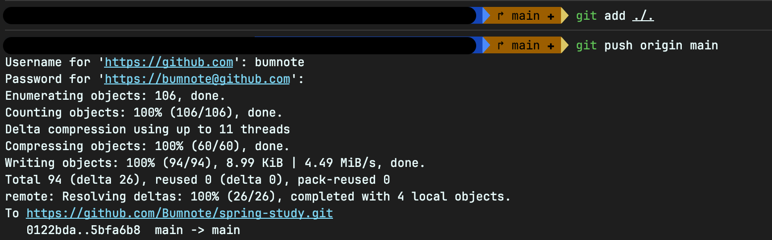 fatal: Authentication failed for 'https://github.com/Bumnote/spring-study.git/'