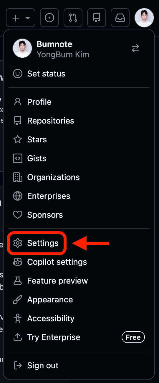 1. 가장 먼저 깃허브 홈페이지에 들어가서 Settings 버튼을 누릅니다.